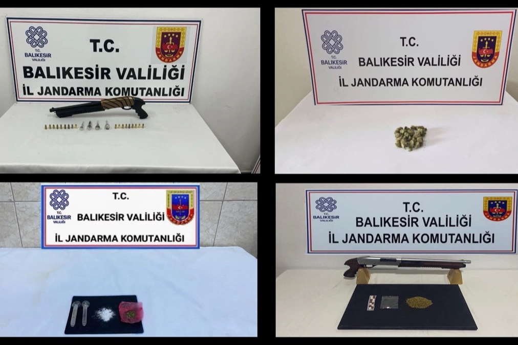 Edinilen bilgiye göre, Balıkesir İl Jandarma Komutanlığınca, kaçakçılık ve uyuşturucu madde suçları ile mücadele dahilinde yapılan çalışmalarda hızla devam ediyor. Ayvalık, Burhaniye, Edremit ve Marmara ilçelerinde kaçakçılık ve uyuşturucu madde imal ve ticareti yapan kişilerin yakalanması için 2 ikamet ve bir araca operasyon düzenlendi. Yapılan çalışmada, 25 gram kubar esrar, 8 adet sentetik uyuşturucu hap, 2 gram metamfetamin, 6 adet uyuşturucu kullanma aparatı, 2 adet av tüfeği ve 18 adet tabanca fişeği geçirildi. Olaya karışan 7 şüpheli yakalanarak gözaltına alındı.