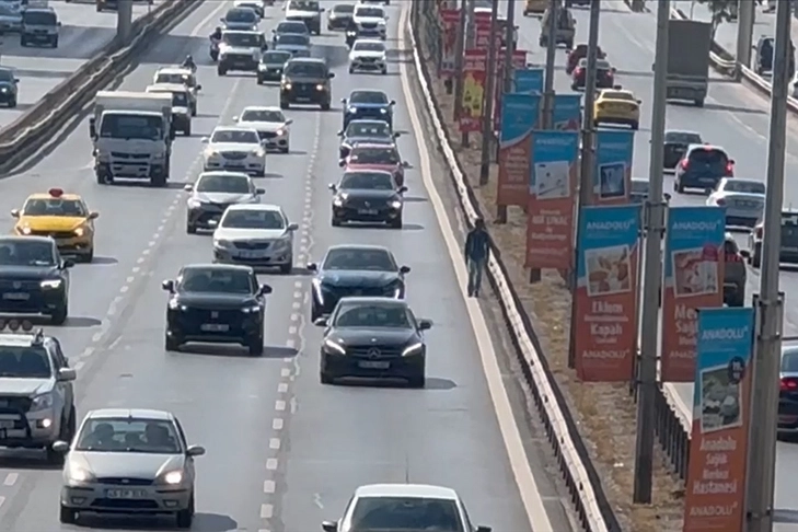 Şeritleri ayıran bariyerlerin yanında görüntülenen kişi zaman zaman ters istikamete geçip, yürüyüşüne devam etti.