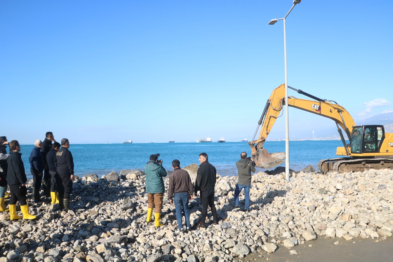 AFAD Başkanı Memiş, 6 Şubat depremleri sonrası sahil bandında 40 metrelik kaymanın yaşandığını belirterek, “Malumlarınız olduğu üzere hafta sonunu hakikaten turuncu uyarılar neticesinde gerçekten böyle çok yoğun bir hava muhalefetiyle geçirdi. Neredeyse bütün Türkiye, özellikle geniş kenarlarında bulunan şehirlerimiz olumsuz yönde etkilendiler. AFAD ekiplerimizin koordinasyonunda kamunun bütün imkanları seferber edilerek can kaybı yaşanmadan hava şartlarının maruz bırakmış olduğu bu durumu yönetmeye büyük gayret sarf ettik. Bugün İskenderun'dayız. İskenderun'da da hafta sonu yaşanan yoğun yağış, fırtına ve deniz taşması neticesinde bu görmüş olduğunuz alan yeniden suyla doldu. Özellikle denizden gelen suyla doldu. Aslında 6 Şubat'ta karada meydana gelen en büyük deprem hadisesinden sonra biz biliyoruz ki yaklaşık 40 santim kadar suya gömülmüştü, kara parçası. Bu İskenderun Körfezi'nin tamamı için bunu söyleyebiliriz. Biz bu durumu bildiğimiz için Ulaştırma Bakanlığımıza bağlı ekiplerimiz deniz taşmasının önüne geçmek maksadıyla bir tahkimat çalışmasına zaten başlamışlardı. Çalışmanın yürütüldüğü alanda yapılan tahkimat sisteminin faydalı olduğunu gözlemledik. Ancak çalışma inşaat halinde devam ediyor iken böyle bir hava muhalefetiyle karşı karşıya kaldık. Dolayısıyla şimdi projede bir revizyona gidilerek yaklaşık 2.2 kilometre alan tahkimat alanı neredeyse 4 kilometreye çıkarıldı. Bu biraz daha bu sorunun kesin çözümüne yönelik bir çalışma olacak” dedi.