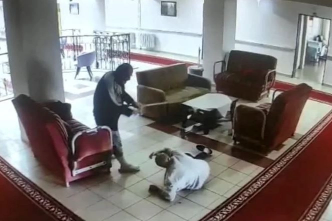 Görüntülerde koridordaki koltuklarda oturan iki huzurevi sakini önce tartıştı. Rasim Ciğer yerinden kalkarak koltuk değneği ile Mehmet Ş.’ye vurdu.