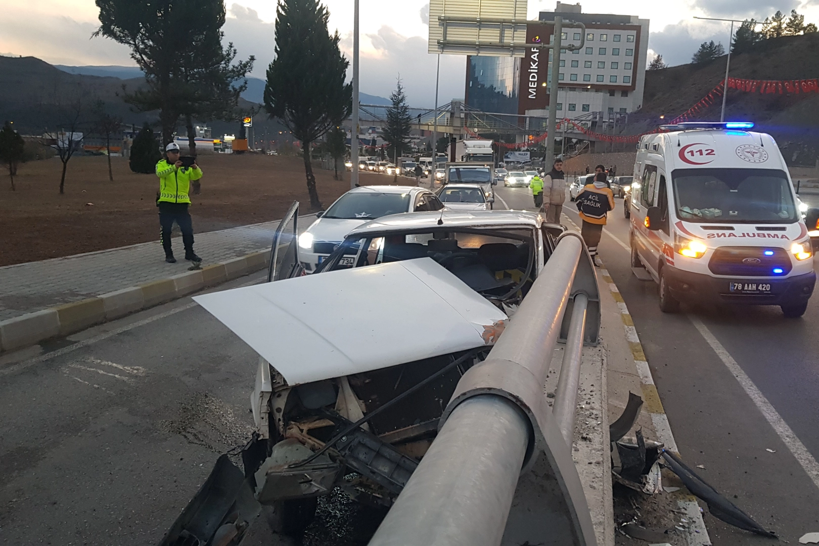 İsmet Akar idaresindeki 78 ABA 153 plakalı otomobil, 100. Yıl istikametine seyir halindeyken sürücünün direksiyonun kontrolünü kaybetmesi sonucu önce levhaya, ardından çıktığı refüjdeki duvara çarptı.
