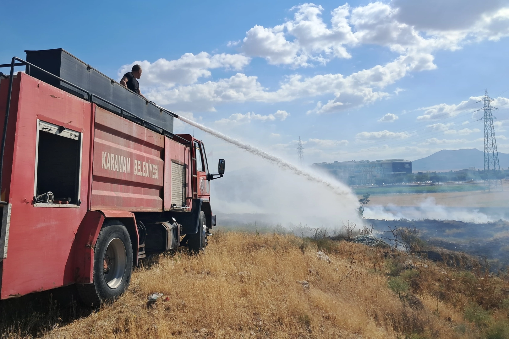 Karaman'da boş arazideki kuru otların tutuşması sonucu çıkan yangın, rüzgarın etkisiyle bir anda tüm alana yayıldı. İtfaiye ekiplerinin çalışması sonucu yangın kontrol altına alınarak söndürüldü.