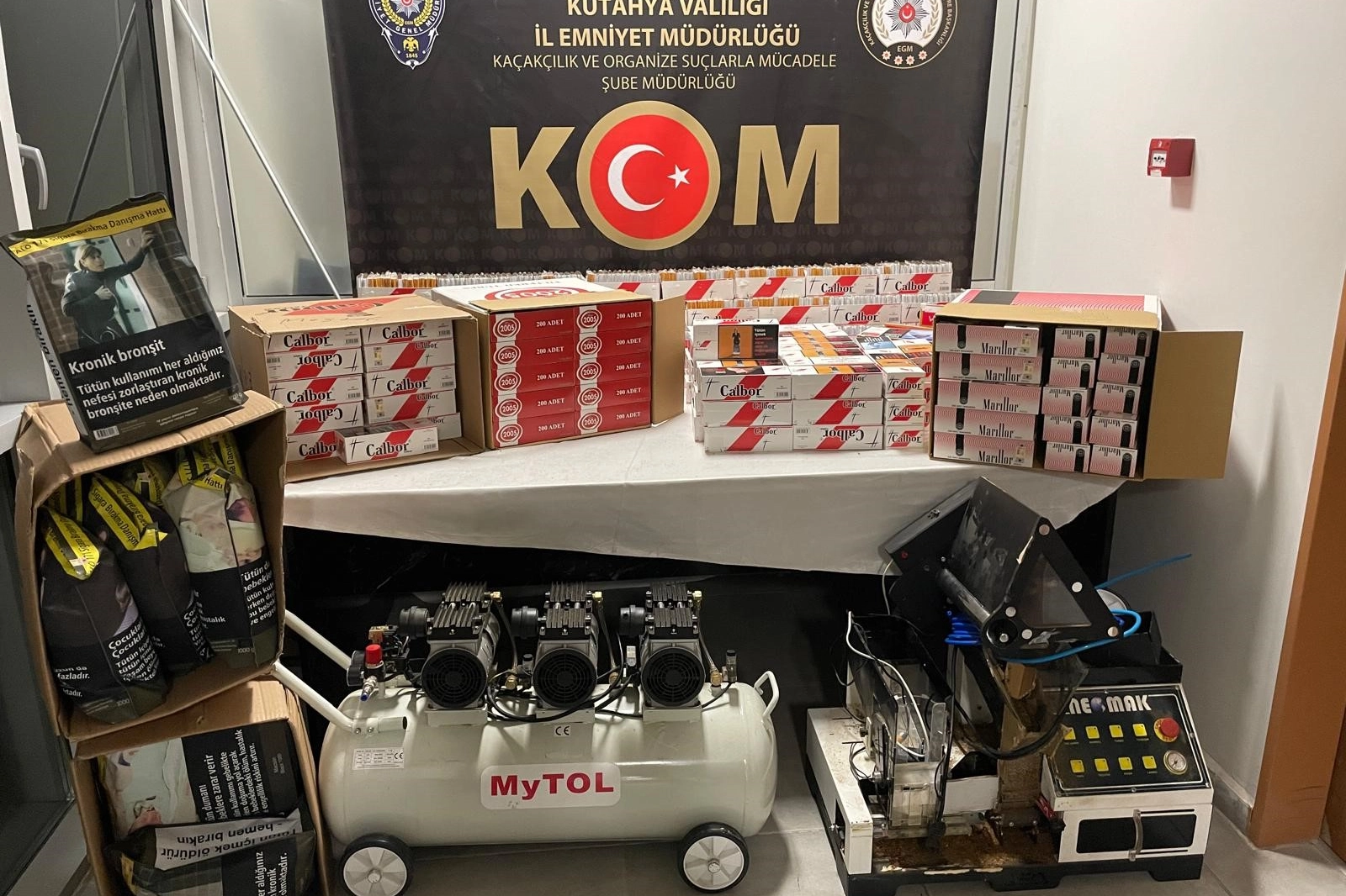Kütahya İl Emniyet Müdürlüğü Kaçakçılık ve Organize Suçlarla Mücadele Şube Müdürlüğünce kaçakçılık suçlarının önlenmesine yönelik olarak yapılan araştırma ve çalışmalar neticesinde, B.K. isimli şahsın adresinde yapılan aramada, 549 paket (19 bin adet) dolu makaron), 151 kutu toplam (30 bin 200 adet) boş makaron, 19 kilogram kıyılmış tütün, 1 adet otomatik elektrikli sigara dolum makinası ve 1 adet hava kompresörü ele geçirildi.