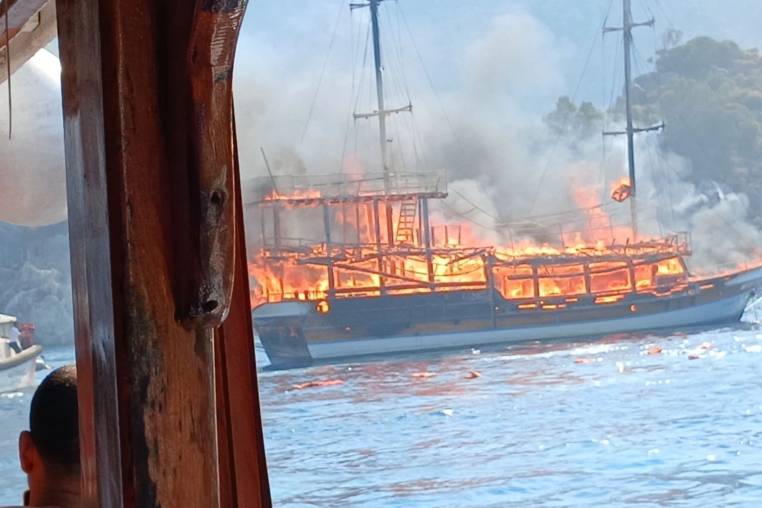 Edinilen bilgiye göre, Marmaris ile Yunanistan arasındaki Keçi Adası yakınlarında bulunan lüks bir ahşap gezi teknesinde yangın çıktı. Kısa sürede tüm tekneyi saran yangını söndürmek için bölgeye ekipler sevk edildi.
