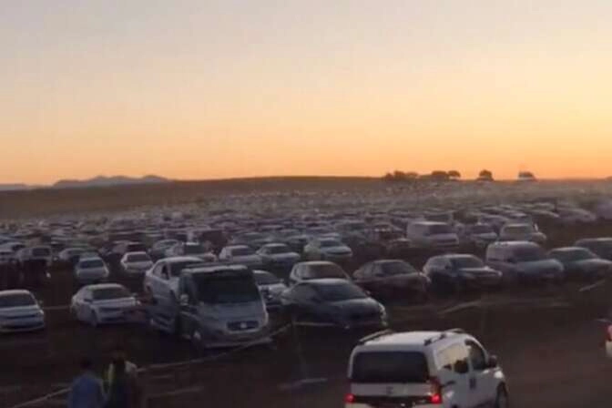 Binlerce araçlık park alanı görüntülenirken cenaze törenine yoğun katılım bekleniyor.