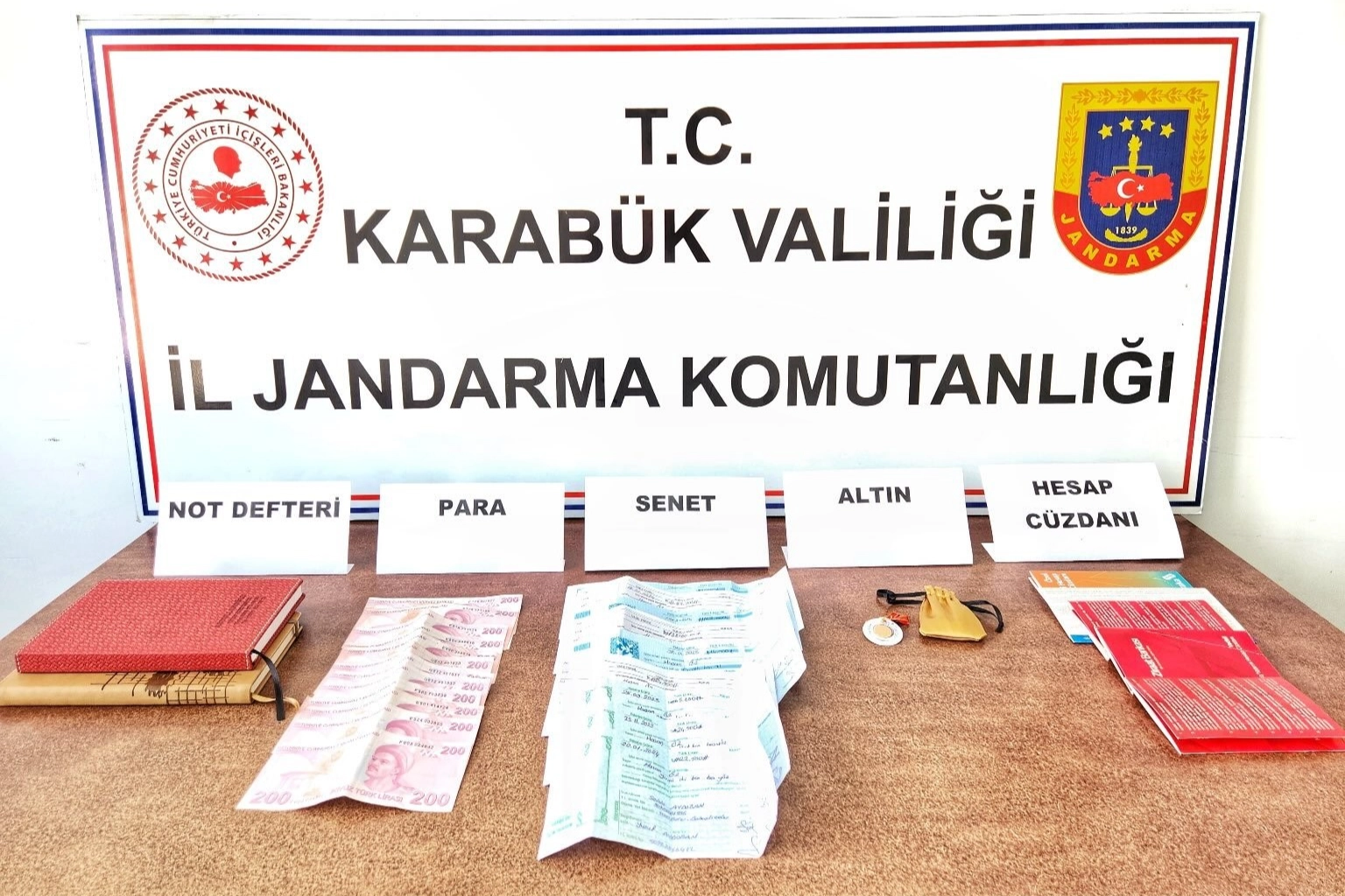 Operasyonda 11 adet farklı şahıslar adına düzenlenmiş senet, 7 adet boş senet, 5 adet farklı bankalara ait hesap cüzdanı, 3 adet çeyrek altın, 1 adet gram altın, 2 bin 700 TL, 2 adet borç ve alacakların yazılı olduğu defter, 3 adet borç ve alacakların yazılı olduğu kağıt ve 1 adet şahsa ait cep telefonu ele geçirildi.