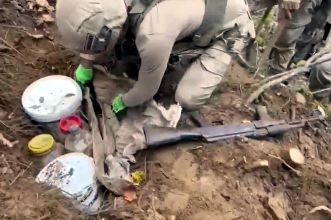 Yapılan aramalarda, toprağa gömülü 2 uzun namlulu silah, 2 şarjör ve 105 fişek ele geçirildi. (AA)