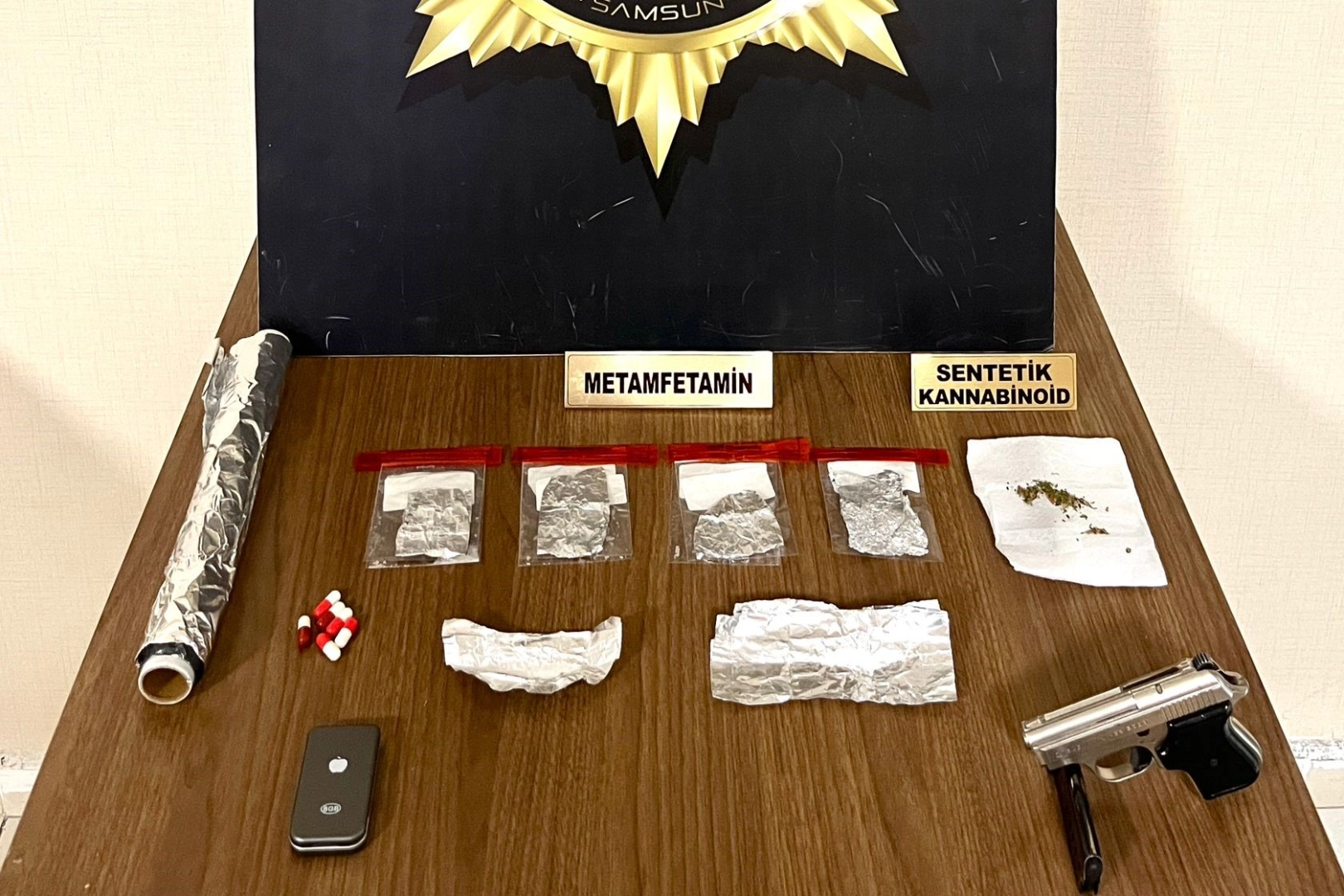 Samsun Cumhuriyet Başsavcılığı koordinesinde uyuşturucu ile mücadele çalışmalarını sürdüren Samsun Emniyet Müdürlüğü Narkotik Suçlarla Mücadele Şube Müdürlüğü ekipleri, ilçe emniyet ve şube müdürlüklerinin de desteğiyle yapılan uygulamada 36 gram skunk, 42 adet sentetik ecza, 5,71 gram metamfetamin, 2,20 gram esrar, 0,76 gram kokain, 0,50 sentetik kannabinoid, 2 adet esrarlı sigara, 1 adet hassas terazi, 2 adet uyuşturucu madde kullanımına yarar aparat, 2 adet ruhsatsız tabanca ve 5 ruhsatsız tabanca fişeği ele geçirdi.