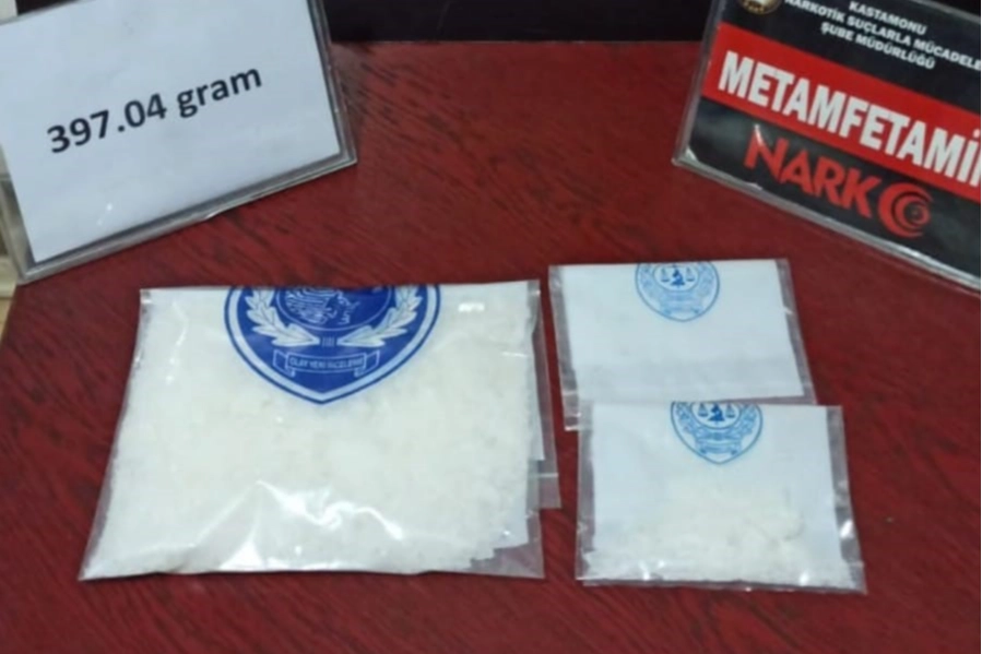 Aramada 397,04 gram metamfetamin ile uyuşturucu içiminde kullanılan cam düzenek ele geçirildi.