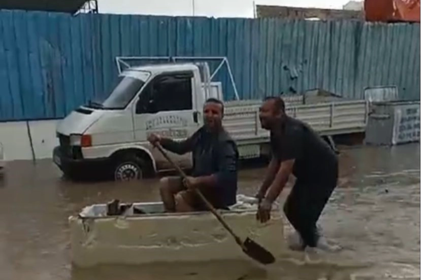 Çalışanlar, yağmurdan dolayı biriken suda hurda malzeme içine girerek küreklerle sandal keyfi yaşadılar.