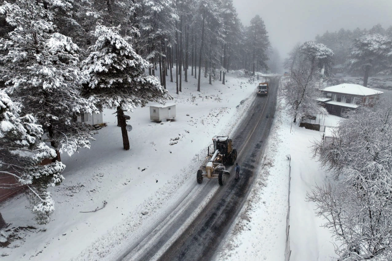 Kazdağları'ndan geçen Edremit-Yenice kara yolunun Hanlar mevkisinde, belediye ekipleri de kar temizleme ve küreme çalışmalarına destek veriyor.