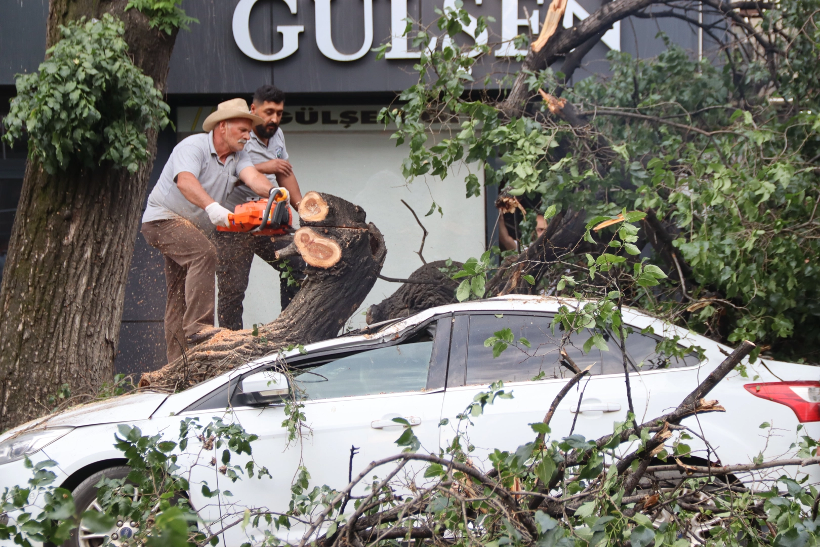 Yaşanan olayda aracın tavanı çöktü, ön camı kırıldı. Ağacın yerinden kaldırılma çalışmaları devam ediyor.