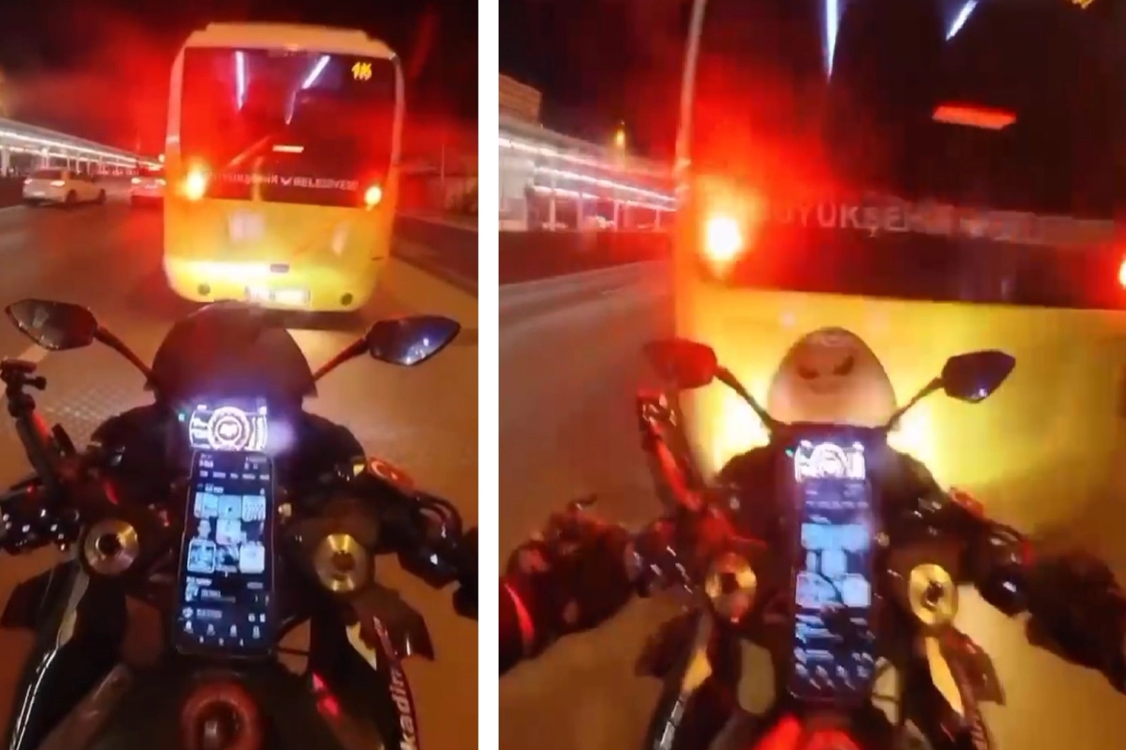 “ALLAH’IM SANA GELİYORUM” SÖZLERİ KAMERAYA YANSIDIGörüntülerde motosikletlinin hızla ilerlerken “Allah’ım sana geliyorum” dediği duyuluyor. Sürücünün bu sözlerinin hemen ardından motosiklet otobüse çarptı. Çarpmanın etkisiyle mucize eseri ciddi bir yaralanma yaşamadığı öğrenildi. Sürücünün kendi imkanlarıyla olay yerinden ayrıldığı belirtildi.