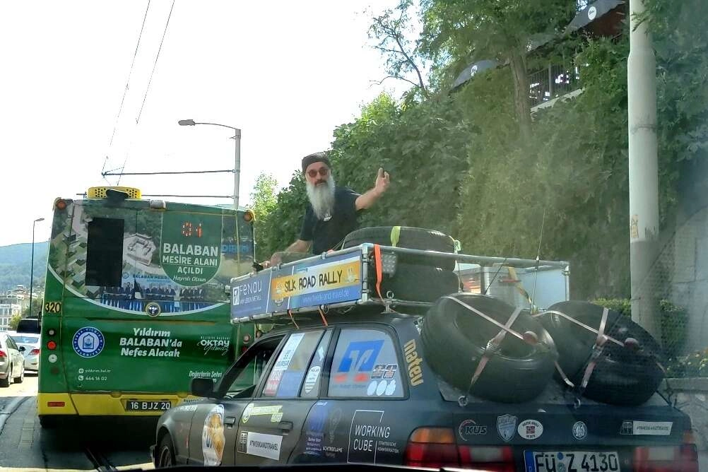 Bursa yollarında Alman plakalı aracı gören vatandaşlar büyük şaşkınlık yaşadı. Otomobilin üzerindeki eşya konulan bölüme çıkan Alman turist bu şekilde şehir merkezinde tur attı. Turisti gören vatandaşlar büyük şaşkınlık yaşadı. Alman turist vatandaşların şaşkın bakışları arasında şehir merkezinde uzun süre turladıktan sonra Tophane meydanında bulunan polisin uyarısı sonucu aracın üzerinden indi.