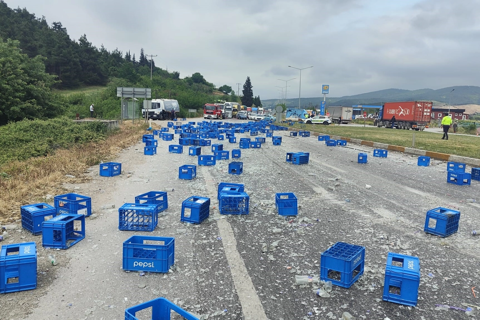 Balıkesir-Bursa karayolunda sabah saatlerinde meydana gelen iki tırın karıştığı trafik kazası, şans eseri maddi hasarla atlatıldı. Kazanın ardından bir tırın taşıdığı cam şişeler ve plastik sepetler yola savrularak ulaşımı aksattı.