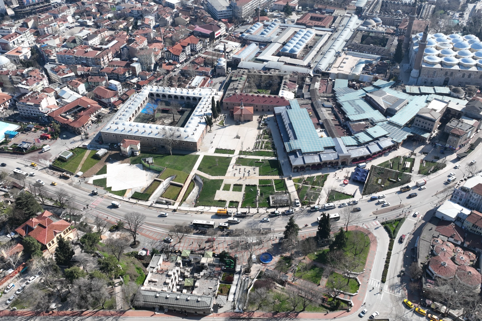 Tarihi kentsel tasarım projelerinin ‘Heykel-Setbaşı-Yeşil-Emirsultan’ tarihi aksı üzerinde yürütüleceğini belirten Başkan Aktaş, özellikle Hanlar Bölgesi’nde yapılan çalışmaların Bursa’ya çok yakıştığını ifade etti. Dirençli şehir Bursa’nın en önemli bileşenlerinden birisinin de yüzyılların yorgunluğunu ve derin izlerini taşıyan tarihi alanlar olduğunu dile getiren Başkan Aktaş, “Uzun yıllardır konuşulan Bursa’nın kalbi konumundaki Hanlar Bölgesi’ndeki ‘Çarşıbaşı meydanı’ projemizle tarihe imza attık. Tam bir açık hava müzesi olan tarihi bölgede 14 tane han, 1 bedesten, 13 açık çarşı, 7 üstü örtülü çarşı, 11 kapalı çarşı, 4 pazar alanı, 21 camii, 177 sivil mimarlık örneği yapı, 1 okul ve 3 türbe bulunuyor. Çevre Şehircilik ve İklim Değişikliği Bakanlığı destekleriyle hayata geçirdiğimiz ‘Tarihi Çarşı ve Hanlar Bölgesi Çarşıbaşı Kentsel Dönüşüm Projesi’ kapsamında tarihi bölgeyi kuşatan 38 binayı yıktık. Etrafı dükkânlarla sarılı 342 yıllık Esiri Mehmet Dede Türbesi ile geçmişi 1549’a kadar uzanan Sağrıcı Sungur Mescidi’ni gün yüzüne çıkarttık. Bakırcılar Meydanı, İpekhan Meydanı, Sağrıcı Sungur Mescidi ve peyzaj düzenlemelerini halkın hizmetine açıldı. Otoparkın da üstü tamamen kapatılarak meydan bir bütün haline geldi. Ancak çalışmalarımız henüz bitmedi. Bu daha başlangıçtı. Tarih boyunca ticaretin kalbinin attığı, UNESCO dünya mirası listesinde yer alan Hanlar Bölgesi’ni ilmek ilmek işleyeceğiz. Hanlar Bölgesi ile birlikte Payitaht şehir Bursa’da tarihi gün yüzüne çıkarmaya devam edeceğiz” dedi.