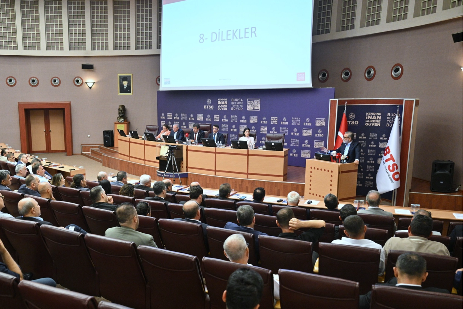 Bursa Ticaret ve Sanayi Odası (BTSO) Haziran Ayı Olağan Meclis Toplantısı, Oda Hizmet Binası’nda gerçekleştirildi. Toplantıya damga vuran açıklamalarda bulunan BTSO Yönetim Kurulu Başkanı İbrahim Burkay, iş dünyasına yönelik vizyon projelerden, savunma sanayisinden kongre turizmine kadar birçok konuda değerlendirmelerde bulundu. Burkay, “İş dünyasının önünü açacak projeleri üretmek zorundayız” diyerek 2030 vizyonuna olan kararlılıklarını yineledi.