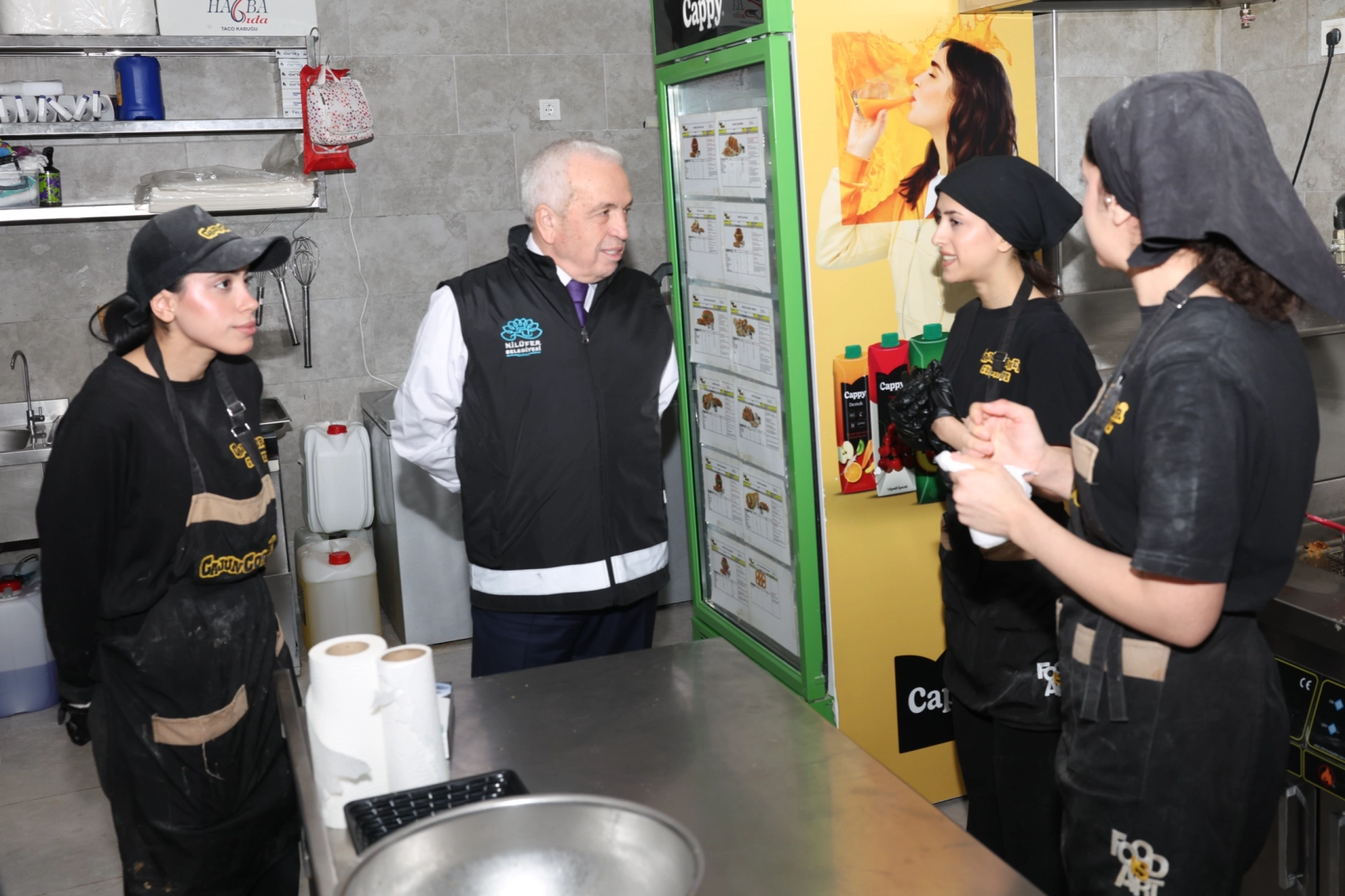 Başkan Şadi Özdemir ve Başkan Yardımcısı Emre Karagöz, mutfakları gezerek ürünler, hijyen ve ruhsat kontrollerini yerinde yaptı.