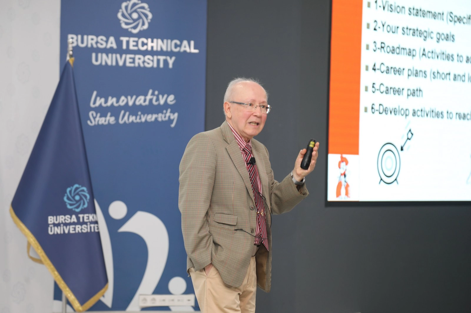 Bursa Teknik Üniversitesi Mimar Sinan Yerleşkesi Turkuaz Salon’da düzenlenen seminere, BTÜ Rektörü Prof. Dr. Naci Çağlar, Rektör Yardımcıları Prof. Dr. Beyhan Bayhan ve Prof. Dr. Barış Tamer Tonguç, akademik ve idari personel ile öğrenciler katıldı.