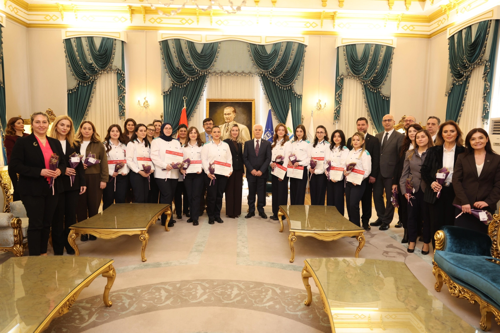 ‘Eğitim Destekli İstihdam Projesi’ kapsamında gerçekleştirilen tramvay ve metro sürücülüğü eğitimlerini başarıyla tamamlayan 10 kadın, belgelerini Bursa Büyükşehir Belediye Başkanı Mustafa Bozbey’in elinden aldı.