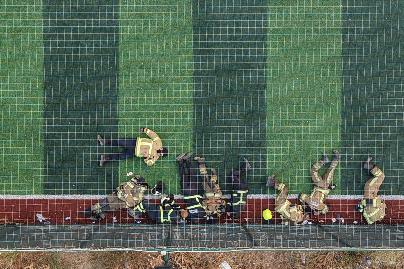 Bursa'da üç ilçeyi etkisi altına alan ve üç köyün tahliyesine yol açan orman yangını sırasında 12 saat boyunca aralıksız çalışan itfaiye ekipleri, sabaha karşı kısa bir dinlenme molası verdi. Yangının şiddetini kaybetmesiyle birlikte, ormanın içinden çıkan ekipler geçici olarak bir halı sahaya yönlendirilerek birkaç saatlik istirahate çekildi.