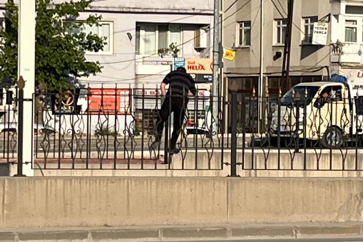 Bursa'nın en işlek ulaşım akslarından biri olan İstanbul - Yalova Yolu üzerinde tehlikeli anlar yaşandı. Görgü tanıklarının ifadelerine göre, bir yaya yaklaşık 100 metre mesafede bulunan üst geçidi kullanmak yerine, tramvay yolundaki demir korkulukları tırmanarak karşıdan karşıya geçmeye çalıştı.