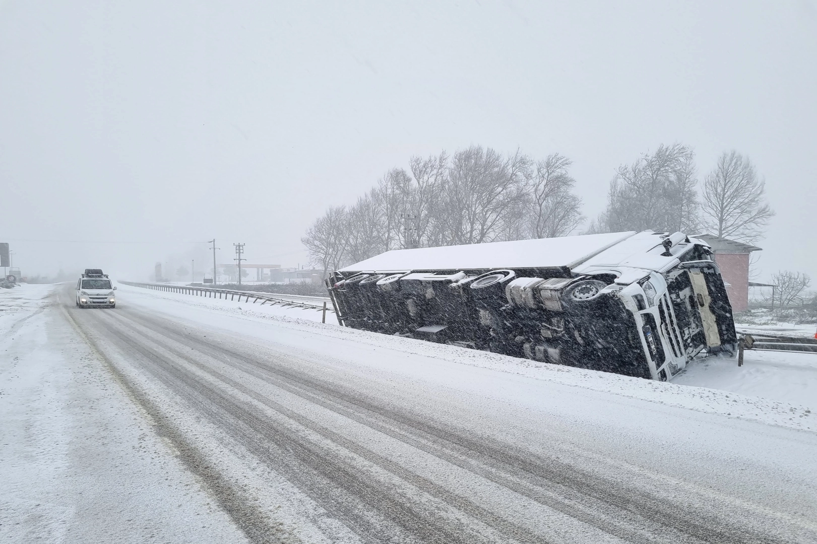 Bursa - İzmir yolu üzerinde ise Karacabey ilçesi Uluabat mevkiinde yoğun kar yağışı sebebiyle yolların bir kısmı karla kaplandı. Bu durum, Bursa istikametinden Karacabey yönüne seyreden 20 AHS 587 plakalı TIR’ın kaymasına ve orta refüje düşmesine sebep oldu. Tırın yan yatması sonucu sürücü kazadan yara almadan kurtulmayı başardı. Olayla ilgili olarak jandarma ekipleri tahkikat başlattı.