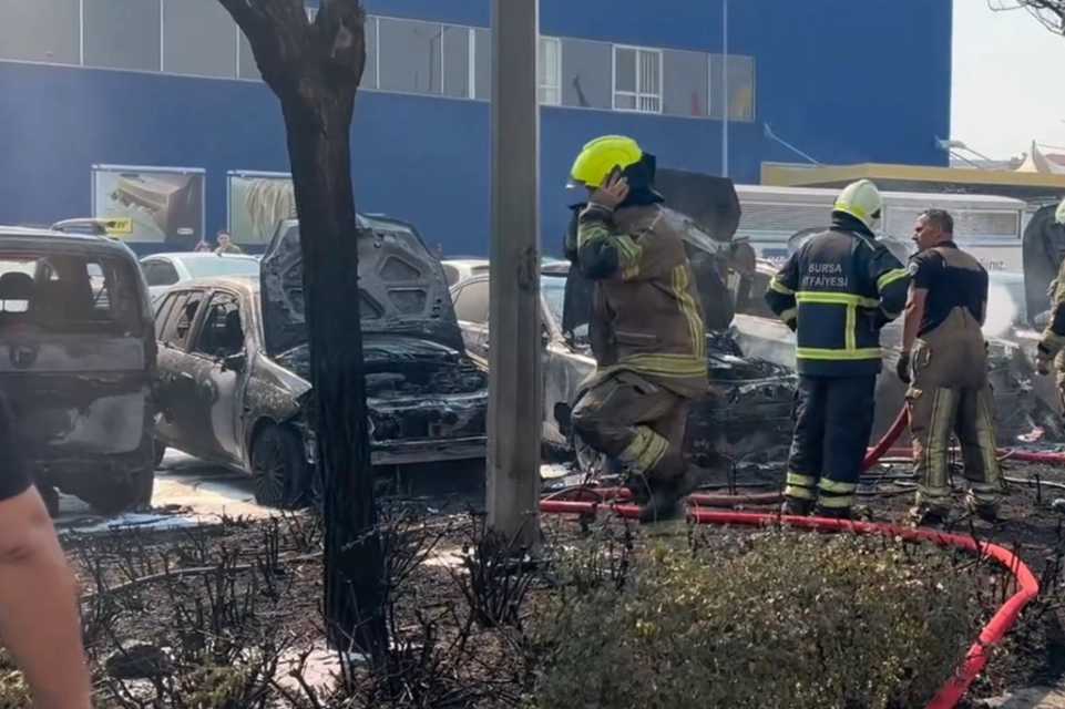 Bursa'nın Yıldırım ilçesinde bulunan Anatolium Alışveriş Merkezi'nin dış otoparkı yakınında çıkan yangın, paniğe neden oldu. Öğle saatlerinde başlayan yangında en az 6 araç tamamen yanarak küle döndü.
