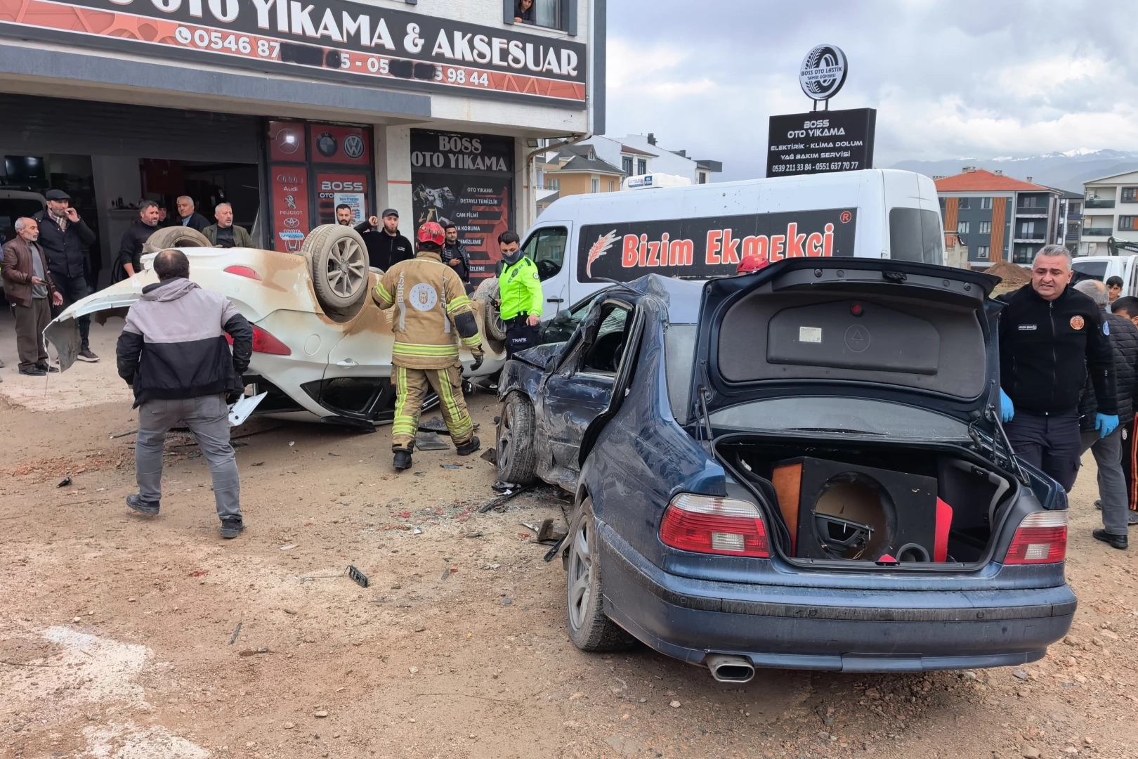 Çarpmanın etkisiyle ters dönen otomobilde sürücü A.B. ile yolcu konumundaki öğrenciler S.B. (14), İ.Ş. (16), E.D. (15), B.A. (15), E.T. (16) ve M.D. (16) araçta sıkıştı. İhbar üzerine olay yerine 112 Acil Sağlık, polis ve itfaiye ekipleri sevk edildi. İtfaiye ekiplerinin titiz çalışması sonucu sıkışan yaralılar kurtarıldı ve ilk müdahale sonrası ambulanslarla İnegöl Devlet Hastanesi’ne kaldırıldı.