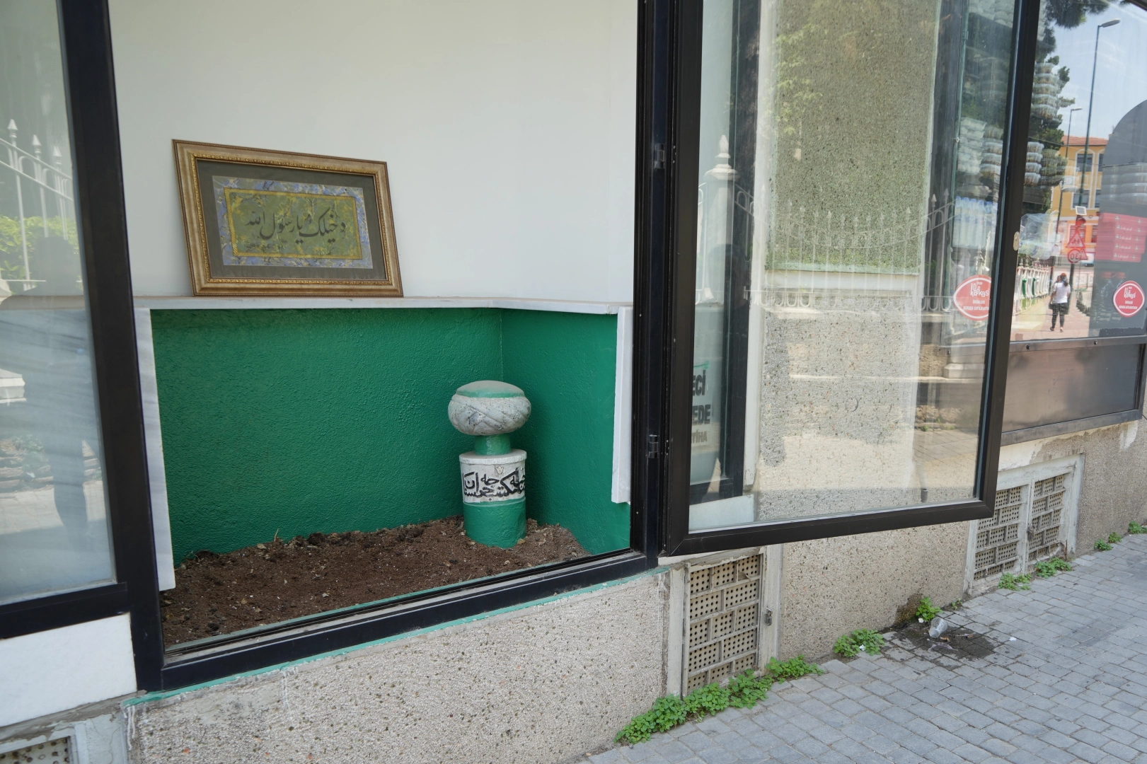 Satın alan vatandaşın 1960 yılında kabre zarar vermeden üzerine 4 katlı bir bina inşa etmesinin ardından binanın giriş katındaki dükkanın içerisinde yer alan mezar görüntüsü ile dikkat çekiyor.
