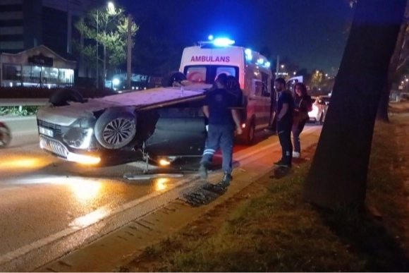 Çarpışmanın etkisiyle savrulan 16 TBE 53 plakalı otomobil takla atarak durabildi.