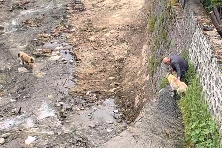 Olay yerine itfaiye ve veteriner ekipleri sevk edilirken, tam hazırlık yapıldığı esnada köprüden geçen bir vatandaş ekiplere yaklaşarak aşağıya baktı. Dere yatağında mahsur kalan hayvanların kendi köpekleri olduğunu gören adam, zaman kaybetmeden paçalarını sıvayıp dereye indi. Sahibinin geldiğini gören Kangalların sevinci kameraya yansırken, adam iki köpeğini kendi imkânlarıyla tek tek sudan çıkararak güvenli alana taşıdı.