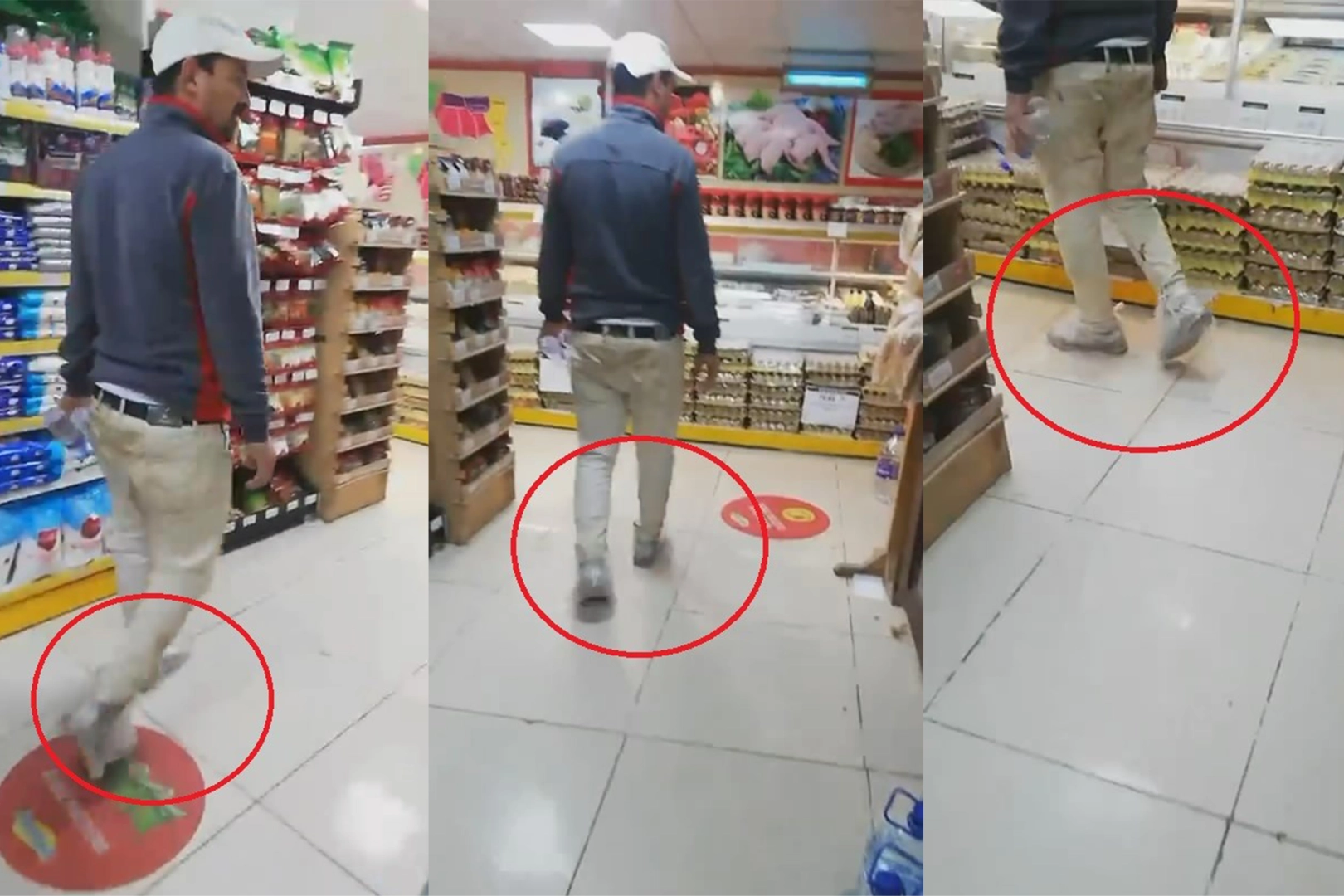 Bursa'da bir inşaatta görevli işçi, su almak için markete gitti. İşçi, market kirlenmesin diye ayaklarına poşet takarak alışverişe başladı.