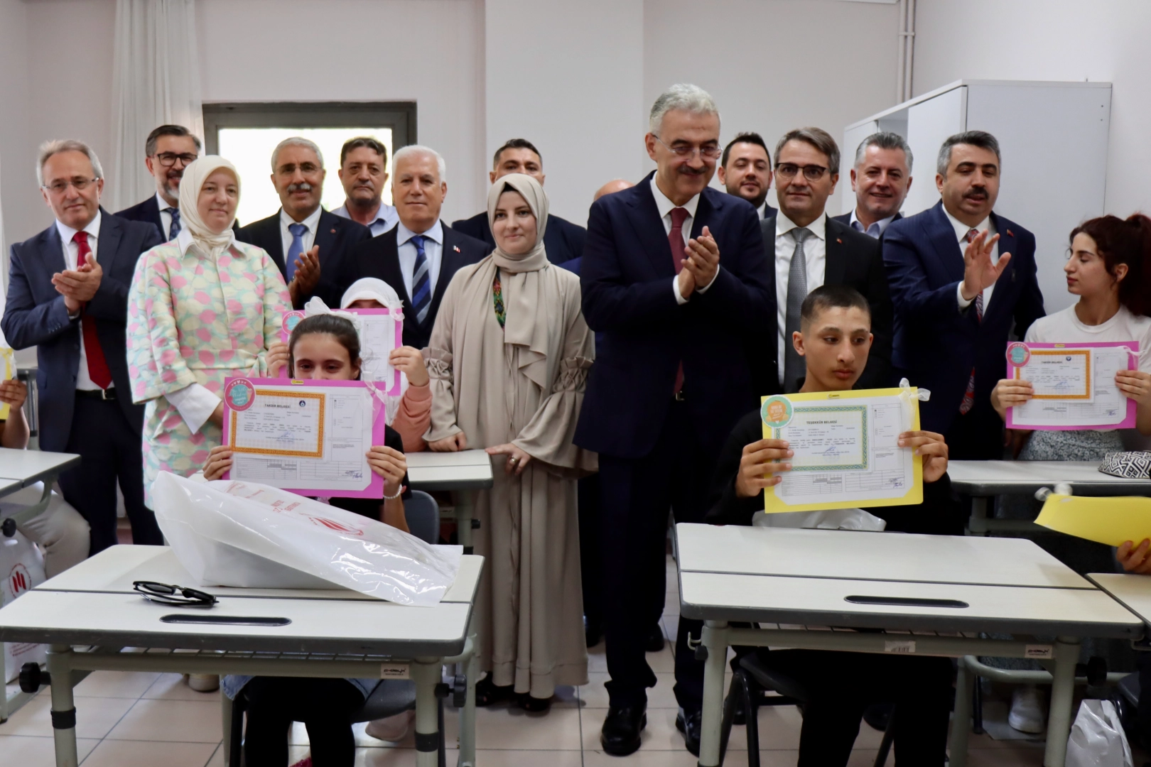 Protokol üyeleri, öğrencilere tek tek karnelerini takdim ederek başarılarını kutladı ve onlarla bol bol hatıra fotoğrafı çektirdi.