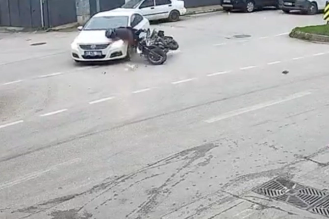 Çarpmanın etkisiyle motosiklet sürücüsü otomobilin üzerine savruldu ve yaralandı.