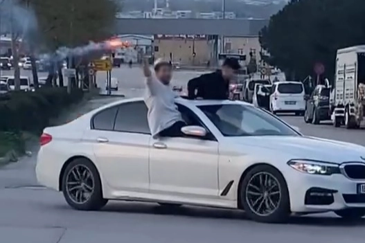 Yaklaşık 7 araçta bulunan kişilerin camlardan ve sunrooflardan dışarı çıkması ise trafik kurallarının açıkça ihlal edildiğini gözler önüne serdi.