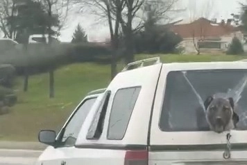 Bursa-Ankara karayolu İnegöl girişinde kaydedilen görüntülerde, arka camı kırık bir kamyonetten kafasını çıkaran köpek, trafikteki sürücüler tarafından meraklı gözlerle izlendi.