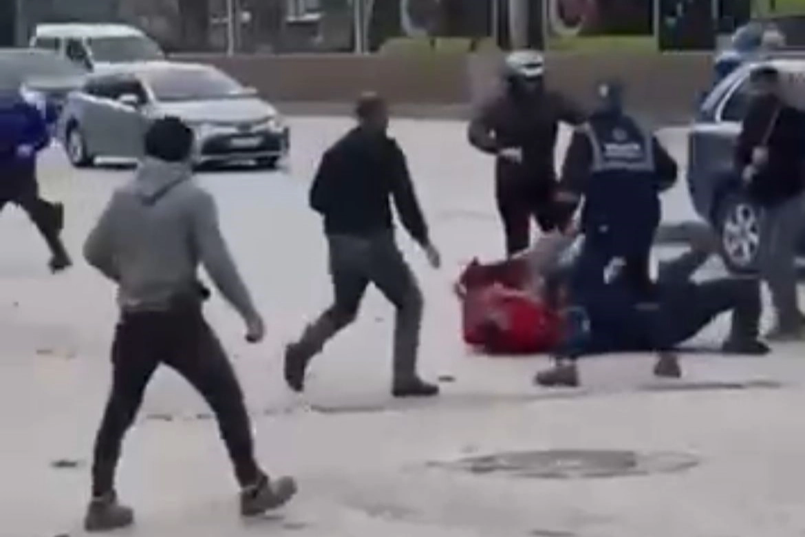 Sopaların ve yumrukların havada uçtuğu kavga anları kameraya yansırken, bazı kişiler kendilerini korumak için kasklarını miğfer gibi kullanarak kavgaya katıldı.