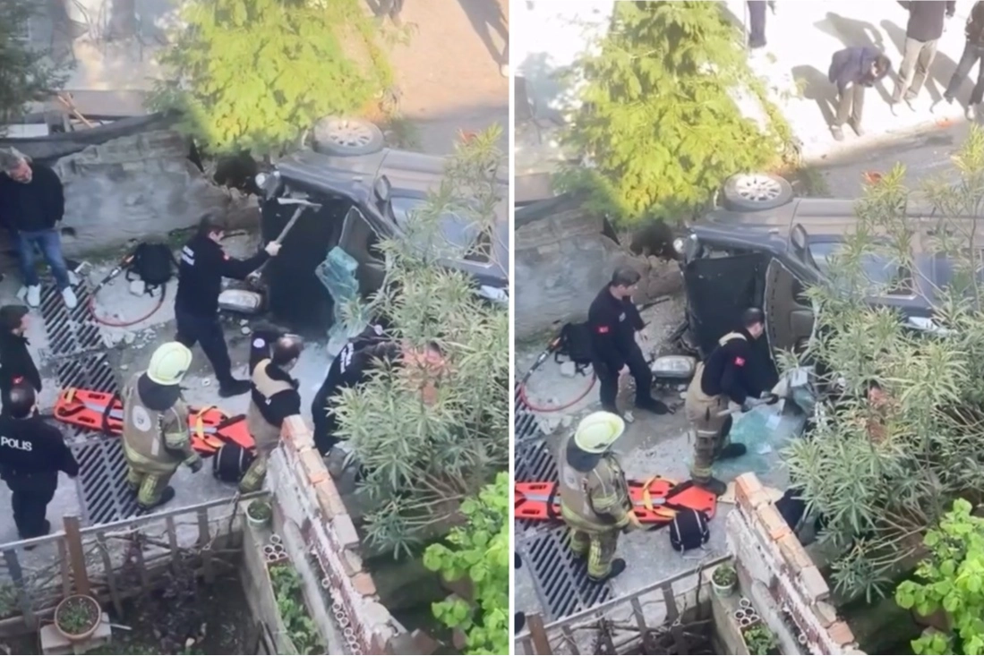 Savrulan araç, yol kenarındaki merdivenlere yönelerek aşağıya doğru yuvarlandı.