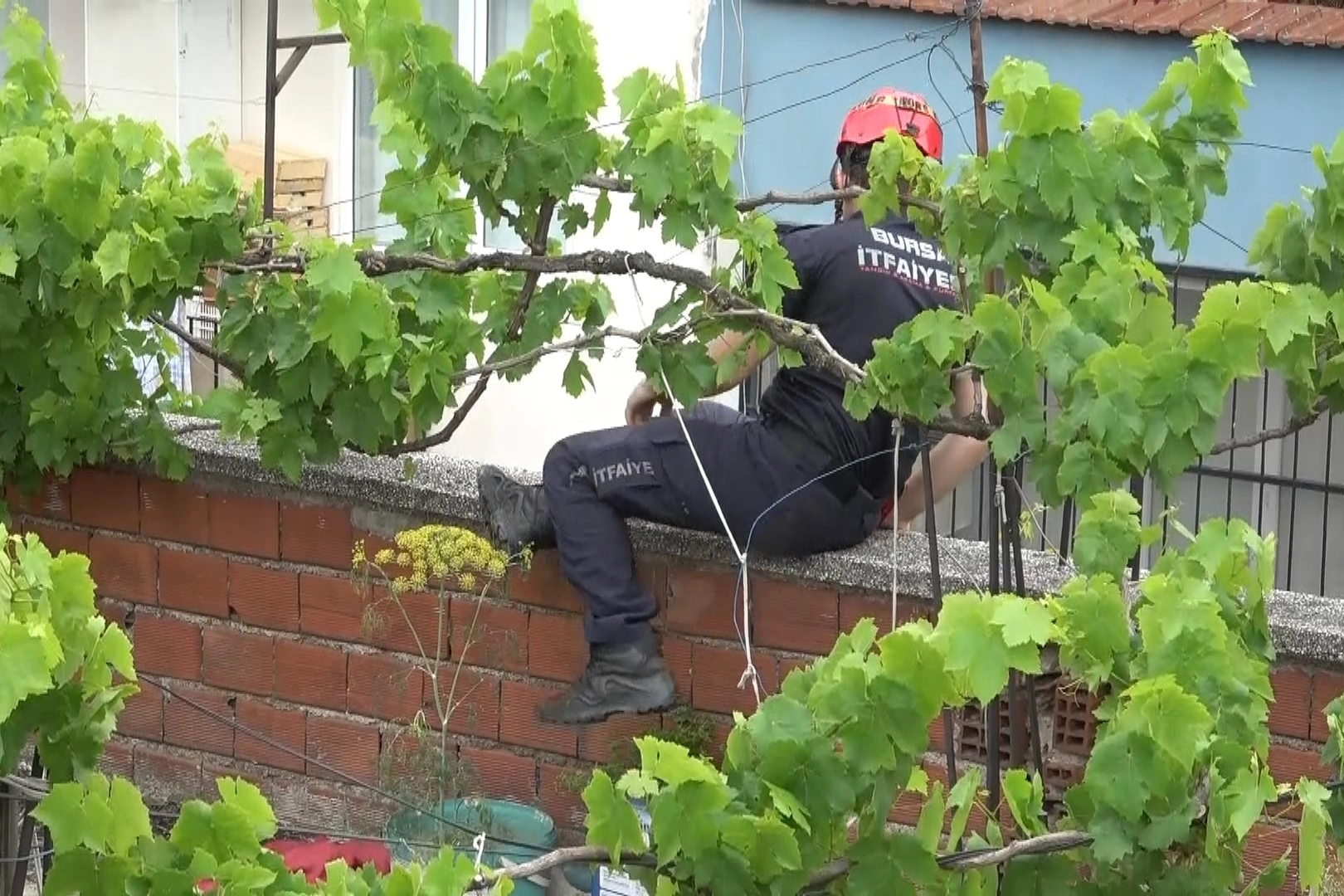 Çatıdan gelen yavru kedi seslerini duyan mahalle sakinleri durumu 112 Acil Çağrı Merkezi’ne bildirdi. İhbar üzerine olay yerine Bursa Büyükşehir Belediyesi İtfaiye Daire Başkanlığı ekipleri sevk edildi. İtfaiye aracının giremediği sokakta inceleme yapan itfaiye eri, yavru kedilerin mahsur kaldığı evin yan binasına çıktı. Çatıdan çatıya atlayan itfaiye ekibi ile kediler arasında kovalamaca başladı.