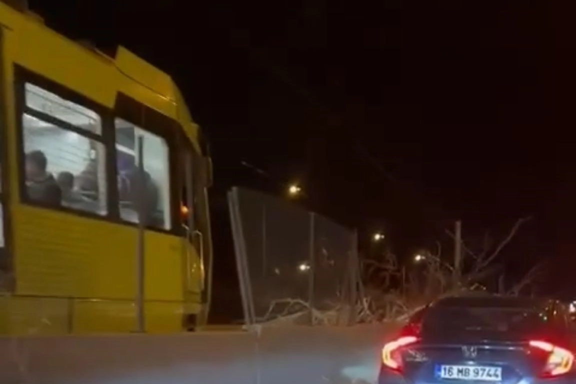 Bursa’da gece saatlerinde etkisini iyice artıran şiddetli lodos nedeniyle metro raylarına ağaç devrildi.