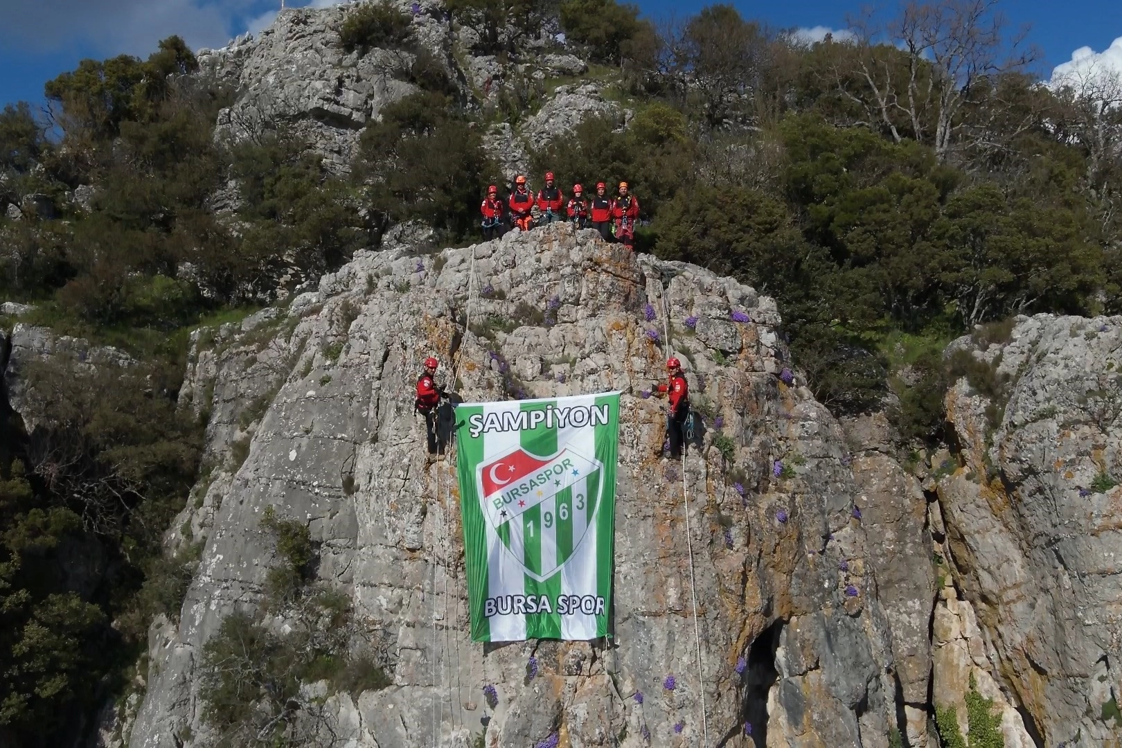 Başarılı tatbikatın ardından zirveye ulaşan ekipler, Bursaspor bayrağını açarak dikkat çeken bir görüntüye imza attı. Bu anlar hem katılımcılar hem de izleyenler tarafından anlamlı bulundu.