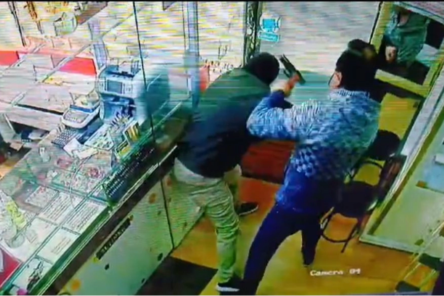 Olayın güvenlik kamerası görüntüleri, soyguncunun ne kadar paniklediğini ve kuyumcunun soyguncuya nasıl vurmaya başladığını anbean kaydetti.