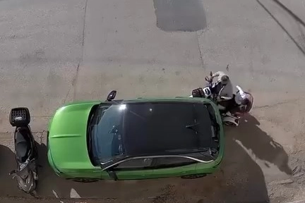 Görüntülerde, elektrikli bisikletin park halindeki otomobile arkadan çarptığı, ardından sürücünün kısa bir süre duraksayıp yeniden aynı araca vurduğu görülüyor. Sürücünün daha sonra hiçbir şey olmamış gibi yoluna devam etmesi dikkat çekti.