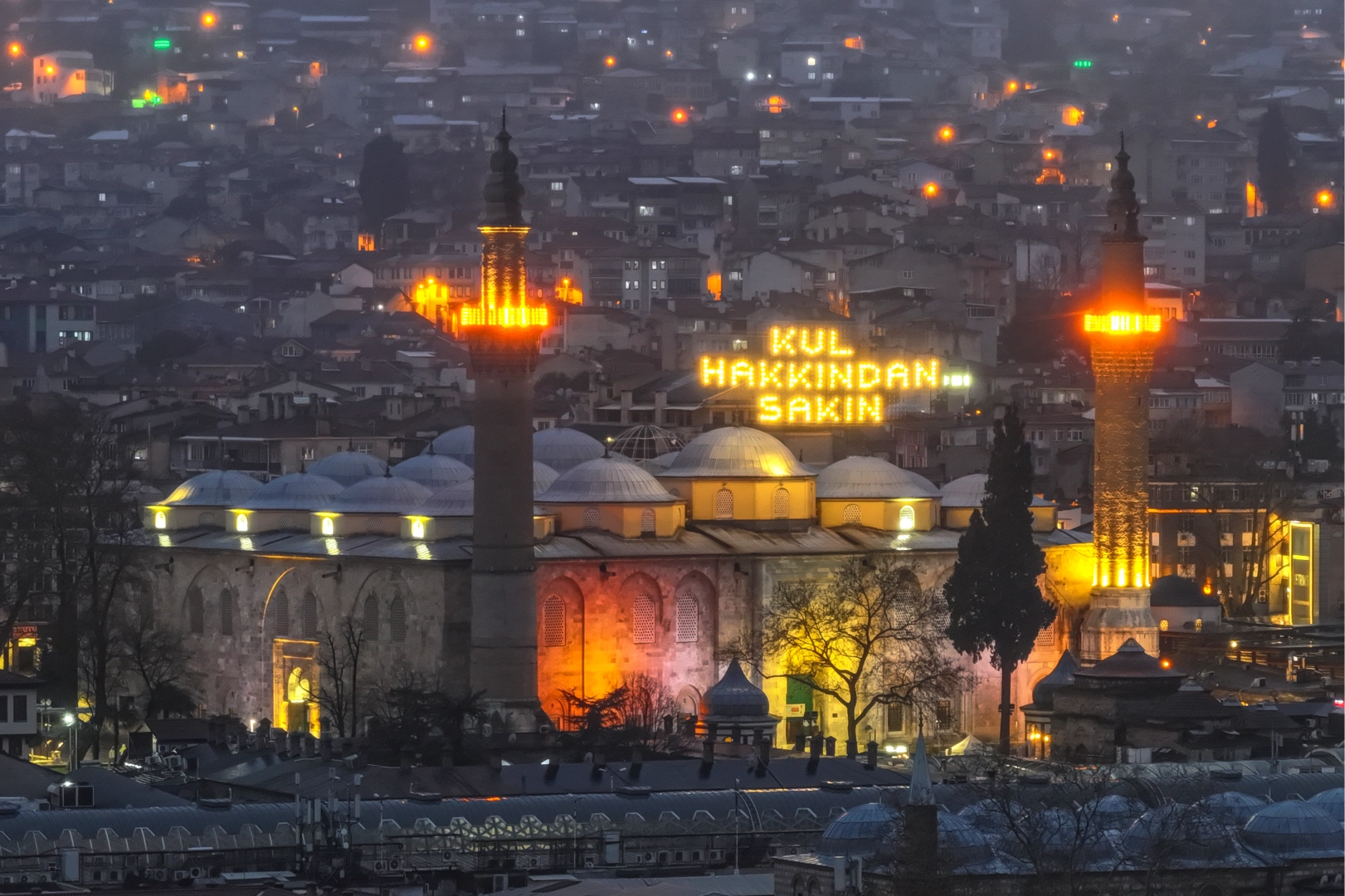Bursa’daki selatin camilerinden tarihi Ulu Cami’ye, Kültür ve Turizm Bakanlığı Bursa Vakıflar Bölge Müdürlüğü’nün koordinasyonunda, Osmanlı’nın son mahyacısı Hacı Ali Ceyhan’ın çırağı Kahraman Yıldız öncülüğünde hazırlanan mahya asıldı.