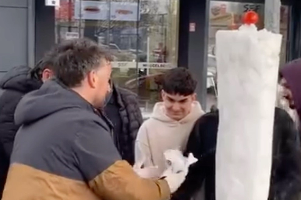 Döner şişine kar kütlesi takan Güneş, iş yerinin önünde topladığı halkla “kardan döner” paylaştı.