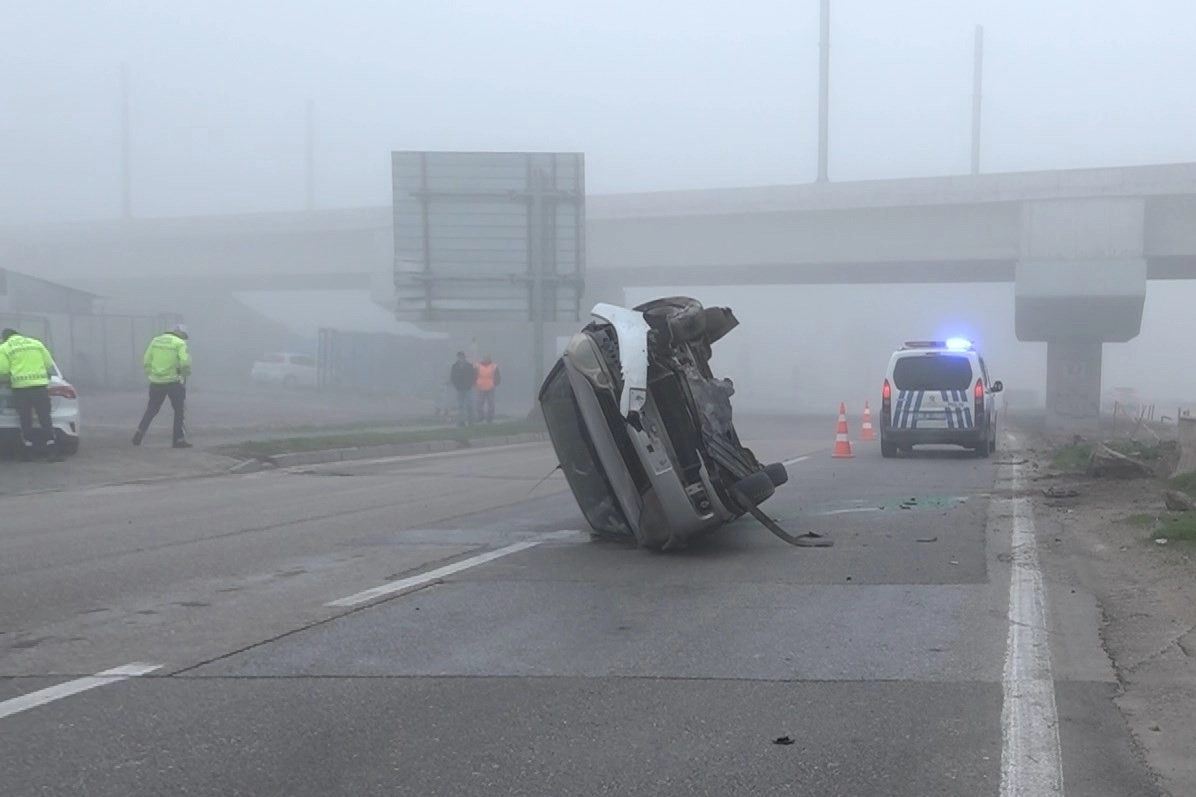Bursa'nın Osmangazi ilçesinde sabah saatlerinde yaşanan trafik kazasında, yoğun sis sebebiyle görüş mesafesini kaybeden sürücü beton bariyere çarptıktan sonra takla attı.