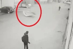 Çocuğun başına gelmeyen felaket, sadece saniyelerle kaçtı. Küçük öğrenci, ne olduğunu anlayamadan yoluna devam ederken, o anlar çevredeki bir iş yerinin güvenlik kamerasına yansıdı.