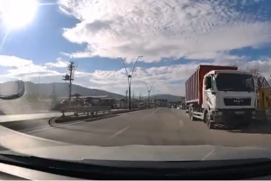 Bir araç kamerası tarafından saniye saniye kaydedilen görüntülerde, kamyonun hızla ilerlemesi nedeniyle diğer sürücüler zor anlar yaşadı.