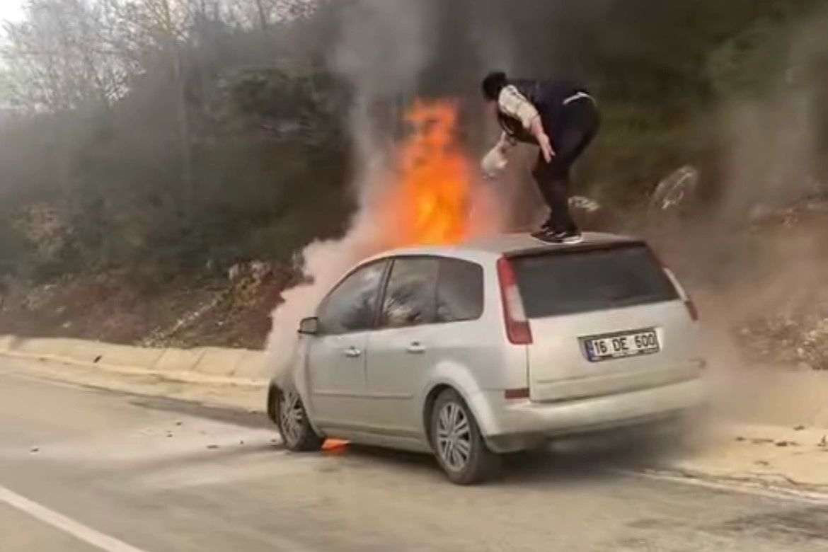 Bursa'nın Osmangazi ilçesinde meydana gelen olayda, seyir halindeki bir araç motor kısmından alev aldı. Yangını fark eden sürücü, aracını hemen emniyet şeridine çekerek müdahale etmeye çalıştı. Olay anı, çevredeki vatandaşlar tarafından cep telefonu kamerasına kaydedildi.